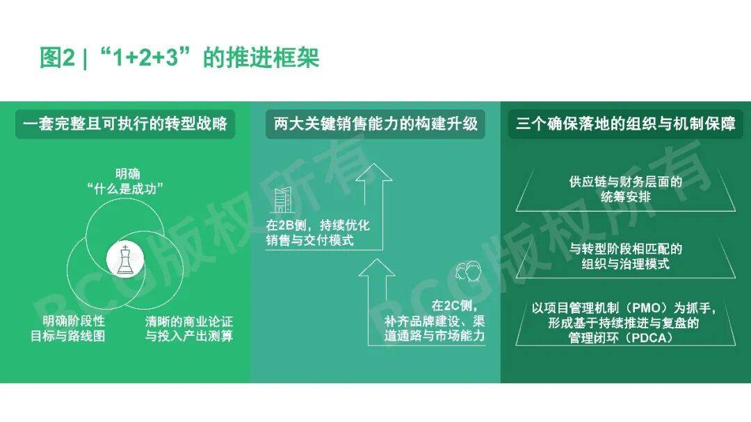 转型从来不是一蹴而就的事情,但在实践中也并非无迹可循。回顾那些成功实现突破的2B企业,它们的转型路径往往呈现出一定的共性,可以总结为一套“1+2+3”的推进框架(参阅图2)。