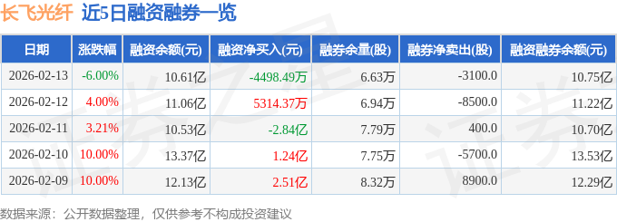 证券之星消息,截至2026年2月13日收盘,长飞光纤(601869)报收于213.39元,下跌6.0%,换手率3.95%,成交量16.04万手,成交额34.61亿元。